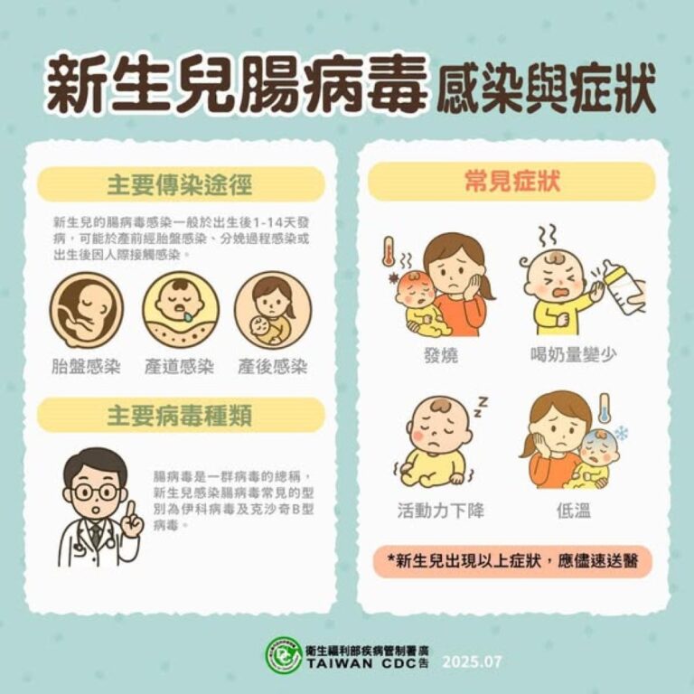 蘇醫師說明,腸病毒潛伏期約3至7天,臨床表現多樣,包括發燒、喉嚨痛、流鼻水、腹痛、嘔吐、腹瀉及皮疹等,嚴重者可能出現腦膜炎、腦炎、心肌炎或敗血症。尤其新生兒免疫力低,感染後風險更高。