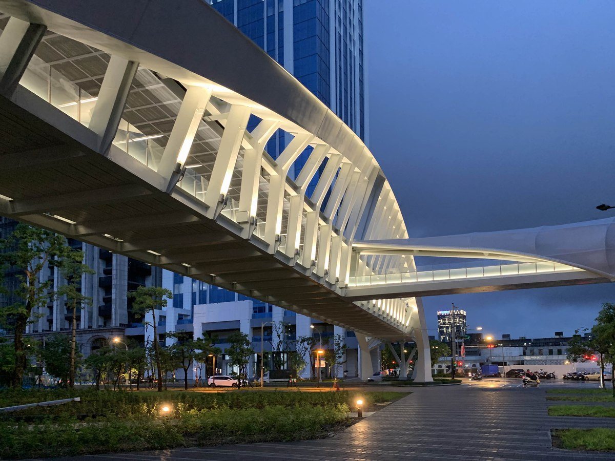「南港立體連通平台」以南港車站為核心,串聯周邊的捷運站、商業區、公園及建築的立體人行系統。照明設計以使用者視角與行走友善體驗為優先,於橋體內部、階梯與平台設置嵌入式或隱藏式燈具,避免燈具外露造成行人碰觸或視覺干擾;欄杆與邊緣照明以間接打光為主,提供柔和光源並有效控制眩光與光害。透過燈光營造出富有特色的夜間視覺焦點,打造一個安全且無壓迫感的通行環境。