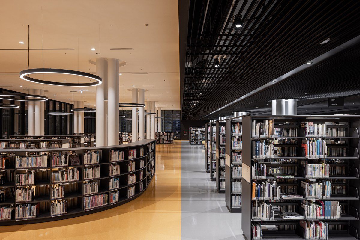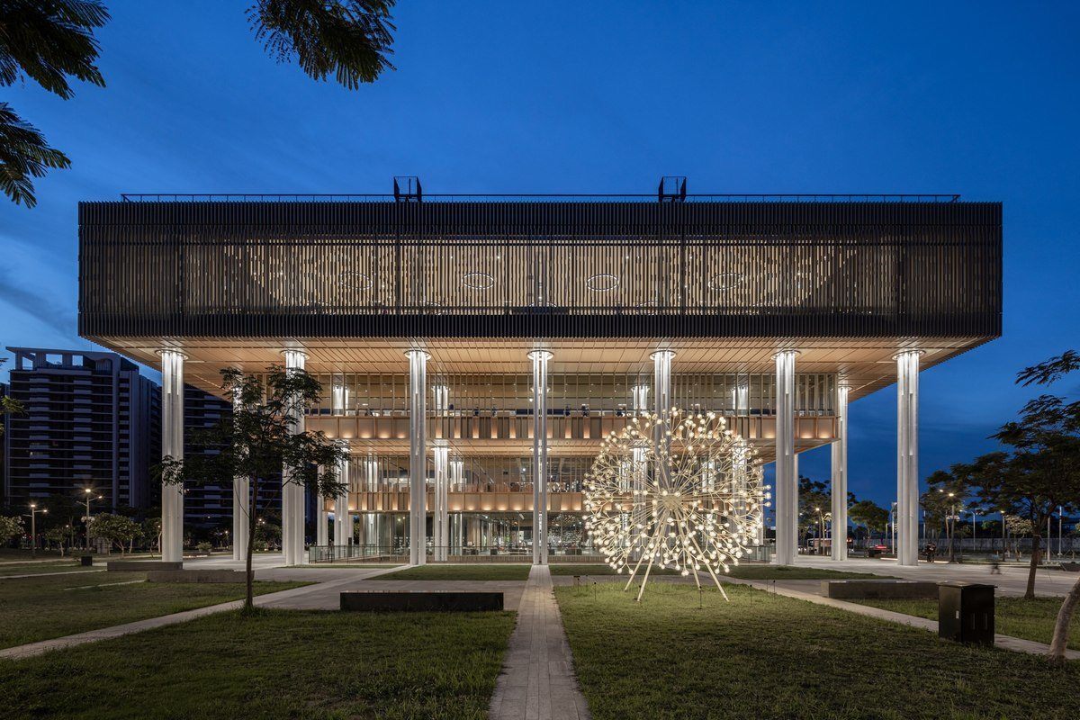「臺南市立圖書館」總館建築外觀以逐層退縮、圓柱竹林及屋頂層臺南窗花造型為亮點,以現代手法轉化歷史與文化元素,賦予建築獨特的藝術性,在光線的照射下,看起來就像充滿韻律波動般,創造出建築的生命力。屋頂層豎向鋁格柵可遮陽與過濾光線,提升室內舒適度並減少人工照明需求;室內則透過空間設計與材質選用,營造溫暖且具有穿透感的氛圍,結合線性格柵天花與照明配置,提供友善且有識別度的閱讀環境。透過室內外LED光源照明系統,創造出一個既流動且啟發感知的文化生活場域。