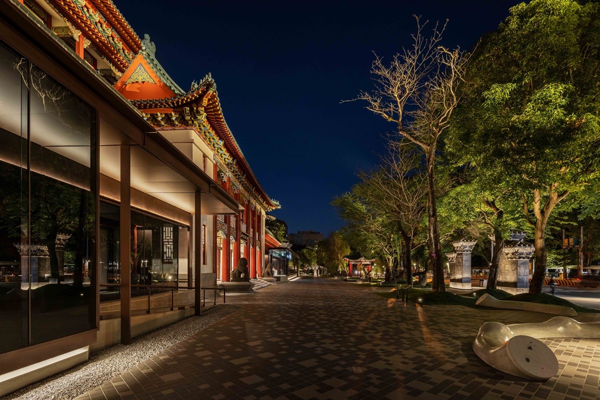 歷時多年整修完成的「國立歷史博物館」,位於南海學園一隅,紅牆綠瓦見證戰後臺灣的文化脈動。燈光設計以隱匿投光與精準配光,展現修復後傳統構件的迷人風采:屋脊細光勾邊,斗拱與彩繪層次盡顯,紅牆綠瓦散發溫潤光澤,藉由暖光襯托飛檐、斗拱與琉璃瓦等建築特色;新設玻璃迴廊與輕鋼坡道,則以微冷光勾勒通透輪廓,與厚重宮牆形成對比,幕牆後的朱紅牆體若隱若現,凸顯新舊並陳的視覺敘事。透過交織的光影,讓館舍化作植物園畔一盞含蓄燈籠,靜謐、和煦卻不炫目。