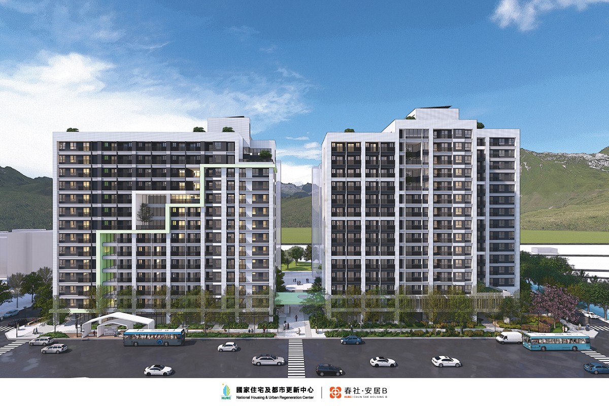 「春社安居B」社宅規劃為2棟地上14層、地下3層的建築,除提供392戶居住單元外,還設置4間店鋪空間。特別的是,本案將設置身心障礙者自立生活中心、日照中心、小作所及社區居住空間,提供多元的身心障礙支持服務。地面層設計採無圍牆概念,以大面積開放空間打造社區花園及樂活廣場,串聯鄰近的「春社安居A」與春社公園,創造與周邊居民共享的休憩環境。