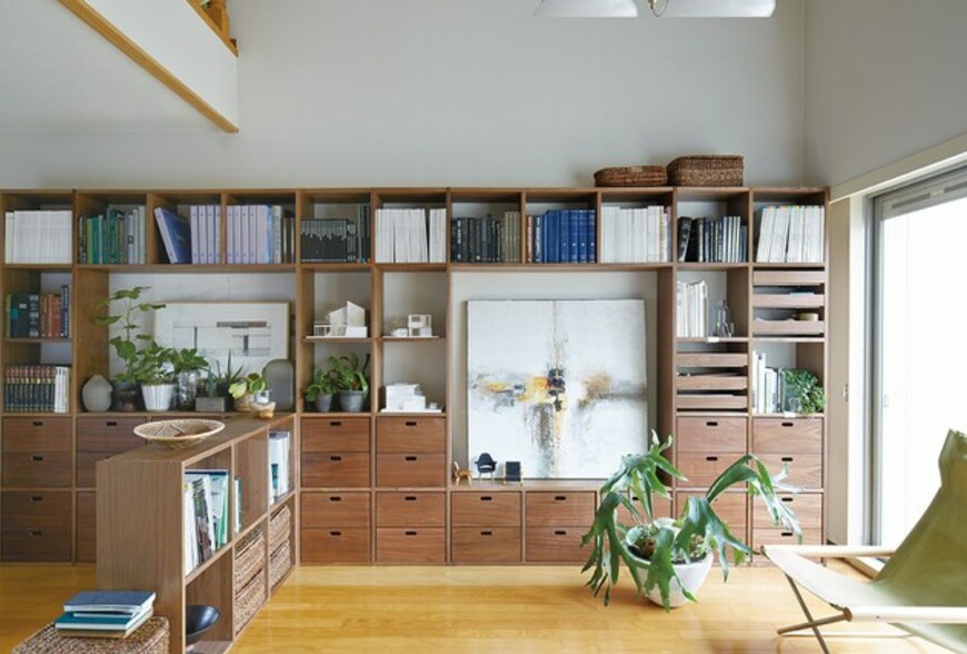 先規劃空間中的收納區與動線區,MUJI無印良品建議可利用自由組合層架系列、SUS層架系列及橡木收納櫃置於空間中單側,打造一整面的垂直收納空間,同時也讓空出的另一側面積更加完整,令動線順暢也能營造留白空間彈性運用。