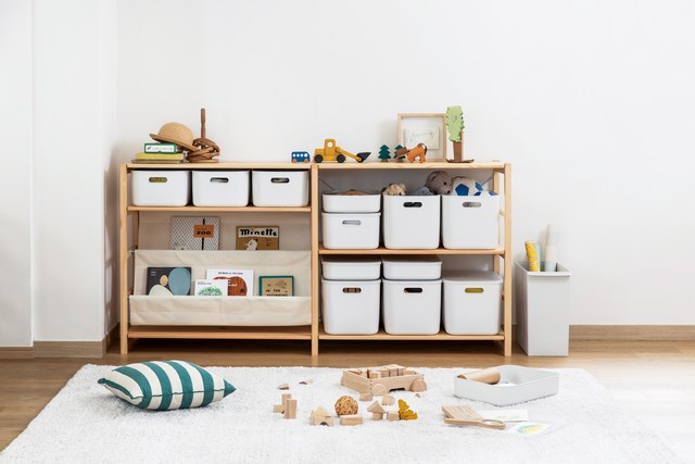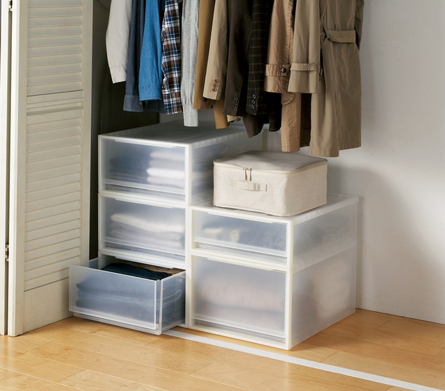 MUJI無印良品建議針對不同用品,可採用不同材質的收納道具收納物件,例如聚酯纖維麻收納系列內層經特殊處理可防濕氣,適合收納換季用的棉被與寢織品。聚丙烯衣裝盒、櫥箱、收納盒系列不僅可置於衣櫥中收納衣物,也可直接放置在側,依據需求作為堆疊的抽屜櫃使用。不鏽鋼收納籃適合收納廚房中瓶瓶罐罐的調味料或大袋包裝的食材與各式餐具、餐盤等。軟質聚乙烯收納盒則因其耐冷熱及防水的材質,不僅可放置於冰箱中收納調味料,PE素材的柔軟特色,也很適合當作兒童的玩具收納箱,輕巧的重量與圓潤的邊角設計,即使是學齡前的孩童使用,也不擔心碰撞,教育孩童從小養成收納習慣。