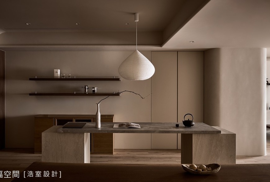 臨窗品茶區為日常增添生活趣味與流動的共享場景;餐廳選用藤編坐椅、原木家具與吊燈點綴,自然材質交織出溫實的生活調性。中島配置 IH爐,便於簡易輕食料理,廚房以玻璃拉門避免油煙逸散,同時維持視覺通透。