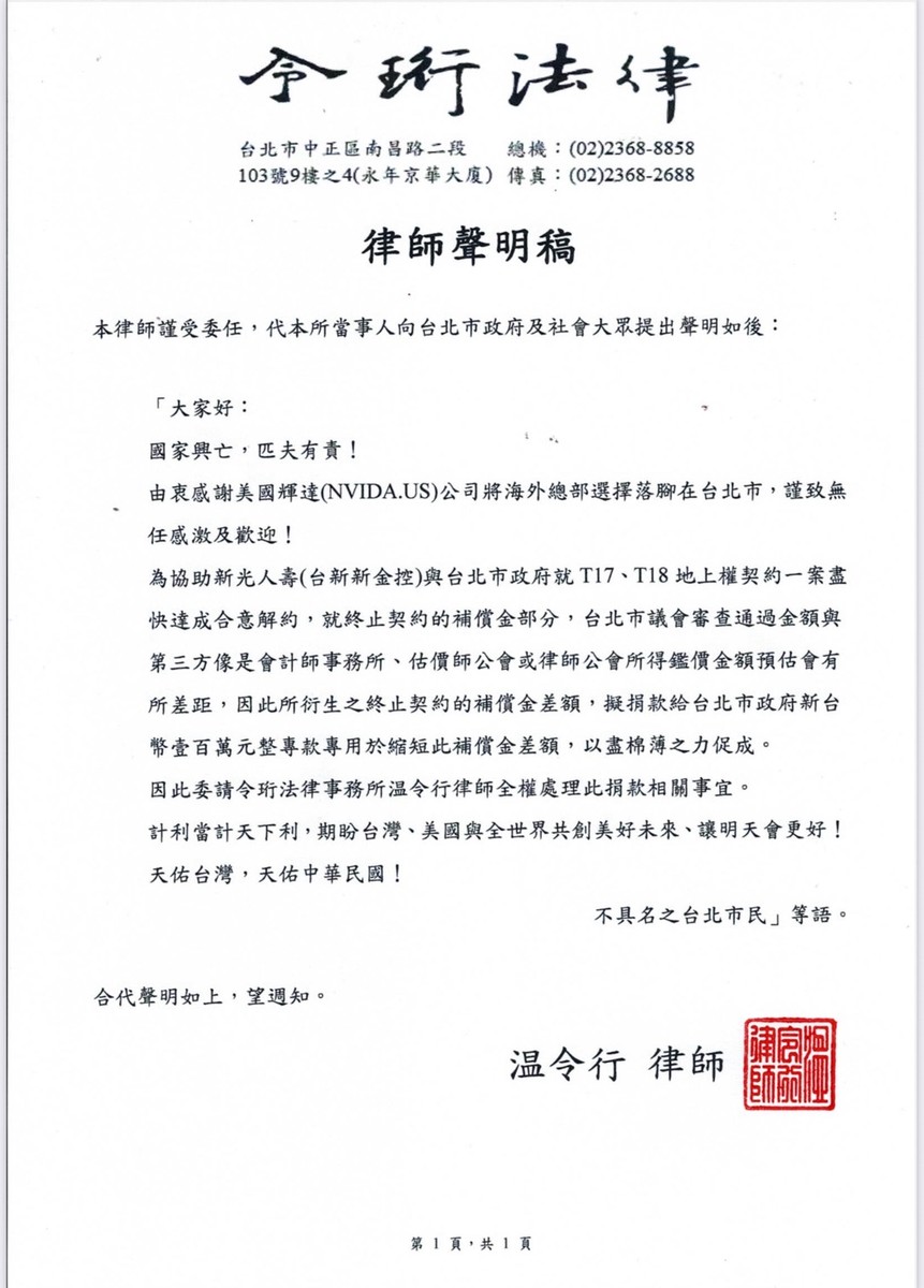 如今,一位熱心民眾「看不下去」,委託令衍法律事務所溫令行律師全權代理捐款事宜,捐出新台幣100萬元整,作為縮短雙方補償金差額的專款,盼能協助談判順利落幕,讓輝達總部落腳台北。