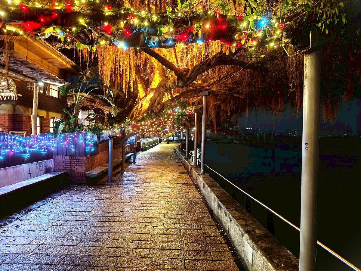 走進淡水捷運站後方的金色水岸,首先映入眼簾的是今年最具甜蜜氣息的主題燈區「光聚甜心時光」,以高達 8 公尺的聖誕樹為主角,搭配環繞周邊的薑餅人守衛隊光雕與繽紛暖色燈光,營造洋溢幸福感的節慶氛圍,成為情侶、親子與好友拍照打卡的熱門亮點。