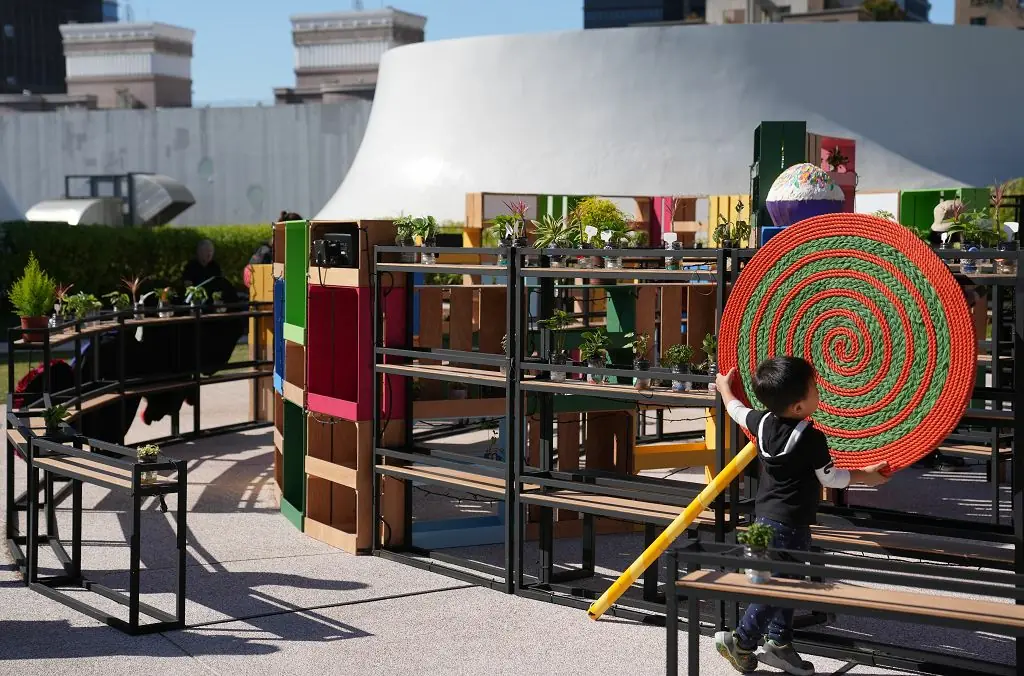 NTT《綠動樂園—花園迷宮探險趣》_設置在迷宮週圍的休憩長椅,運用劇場汰換的舞台木地板打造,透過創意設計,將藝術與永續理念融入生活空間中。©臺中國家歌劇院歌劇院藝術總監邱瑗表示,《綠動樂園》象徵歌劇院推動永續理念的重要一步。場內許多物件皆由再利用材料打造,包括由寶特瓶回收再製的植栽容器,以及以汰換舞台木地板重新設計的休憩長凳,全由館內同仁親手製作完成。迷宮中播放的情境音樂,則由聶琳精心挑選,讓視覺、觸覺與聽覺交織成獨特的沉浸式體驗。