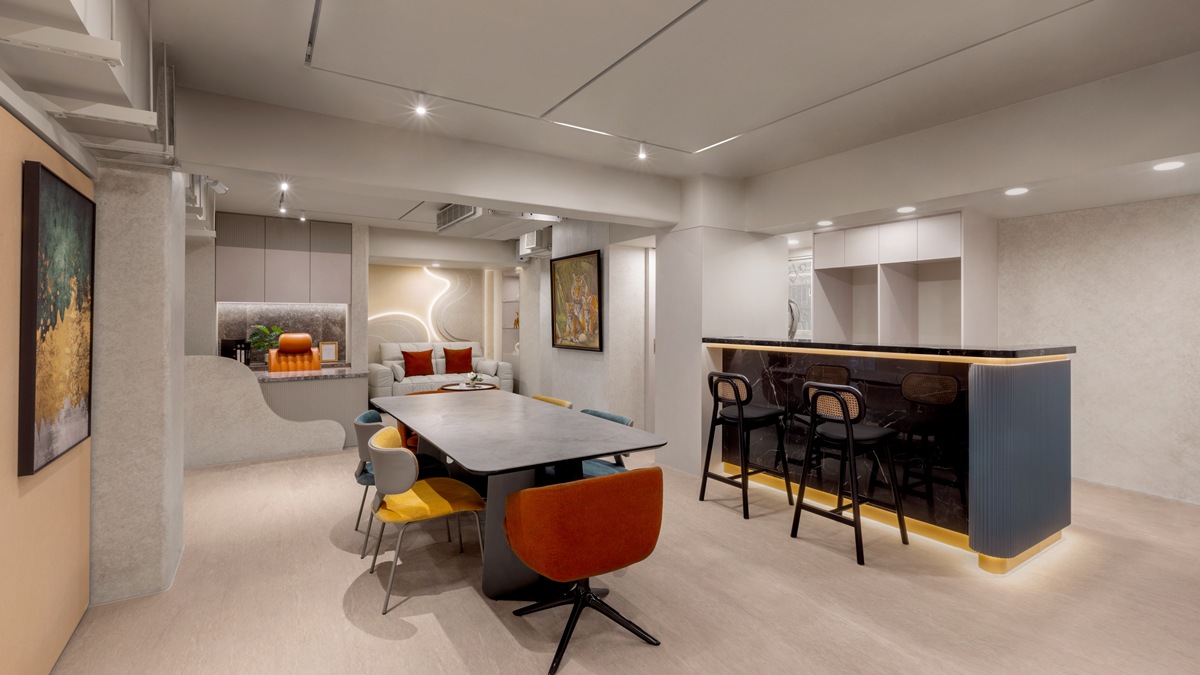 此處為三宅一秀室內設計在台北的第二個辦公據點,鑑於設計總監需經常會晤高端客戶,遂將空間定位為高級招待藝所,並明確劃分出招待區、辦公區、藝術展示區、烹飪區,續加入中島、吧檯以提升社交性,風格上藉由灰色特殊漆牆面烘托藝品美感,吧檯則以黑金配色與大理石、珠光藤色玻璃、金色噴漆等奢雅建材憑添貴氣,續以柔美流線與細膩精湛的線條處理細節,闡述「美學與實用」、「獨特與創新」、「內蘊兼優雅」的豪邸美學。