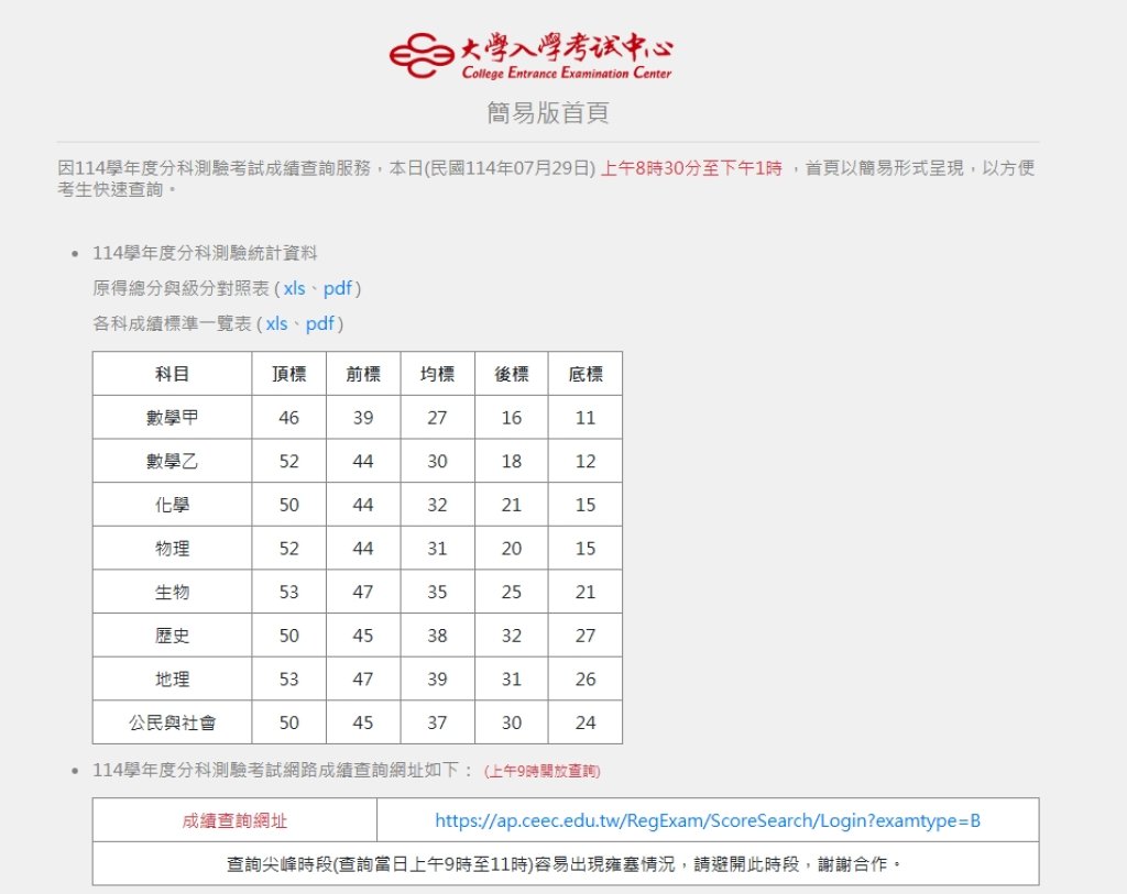 【賴傳媒、記者爆料網 林千允/台北報導】114學年度分科測驗已於7月11、12日順利舉行,吸引近3.9萬名考生報考。今日(7月29日)上午,大學入學考試中心正式公布成績,並同步寄發成績通知單,考生可自今日上午9時起至8月31日下午5時,透過大考中心官網(https://www.ceec.edu.tw)查詢個人成績。
